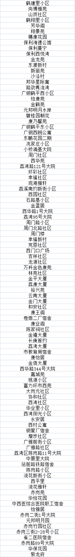 鹤建里小区,尚博雅苑,山顶社区,鹤翔里小区,芳华阁,翔景苑,穗康花园,保利海德公馆,保利曼宁,保利西悦湾,金龙苑,东漖新村,新丽苑,沙洛村,邦华星际寓,路劲隽泷湾,广钢鹤平西小区,怡康苑,金鹤苑,元邦明月水岸,碧桂园朝花,康乃馨苑,广钢鹤平东小区,广钢西朗公寓,