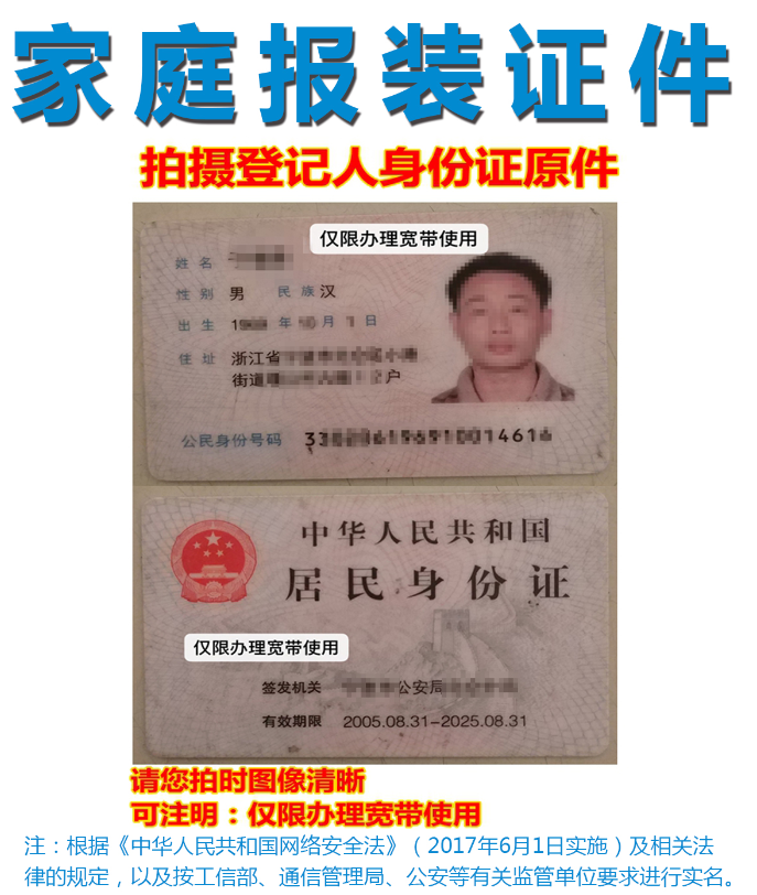 :有老移动号码的报装,需要提供身份证正反面照片,此照片仅用于宽带实名认证。